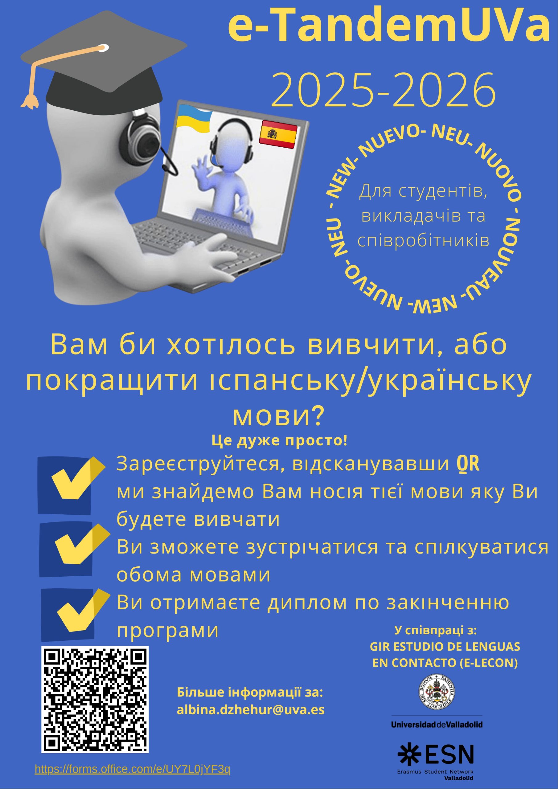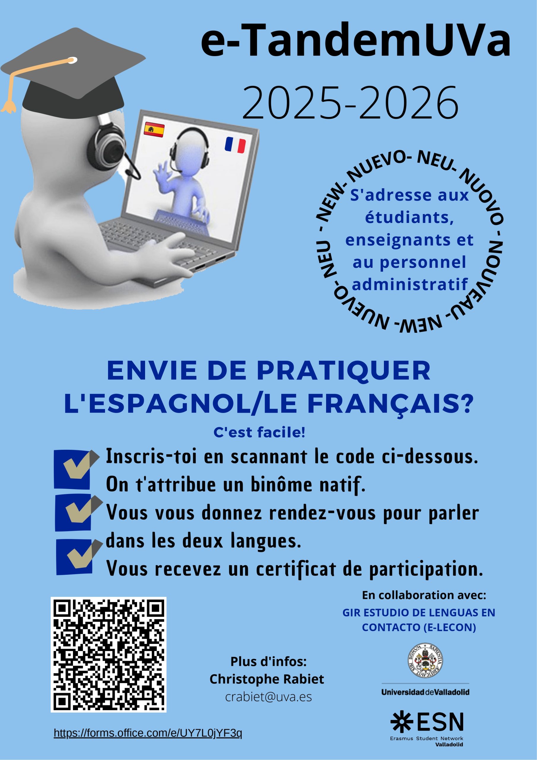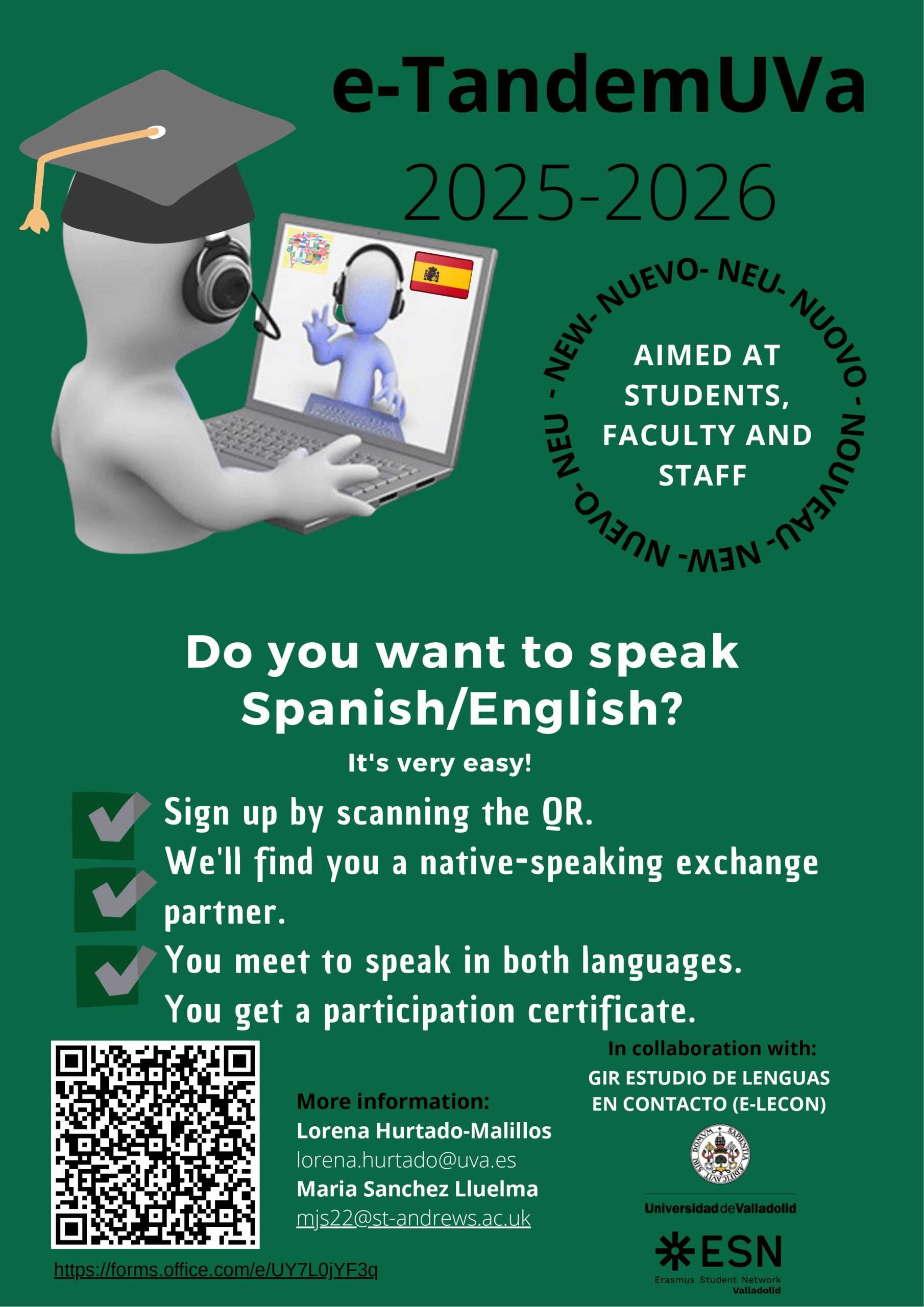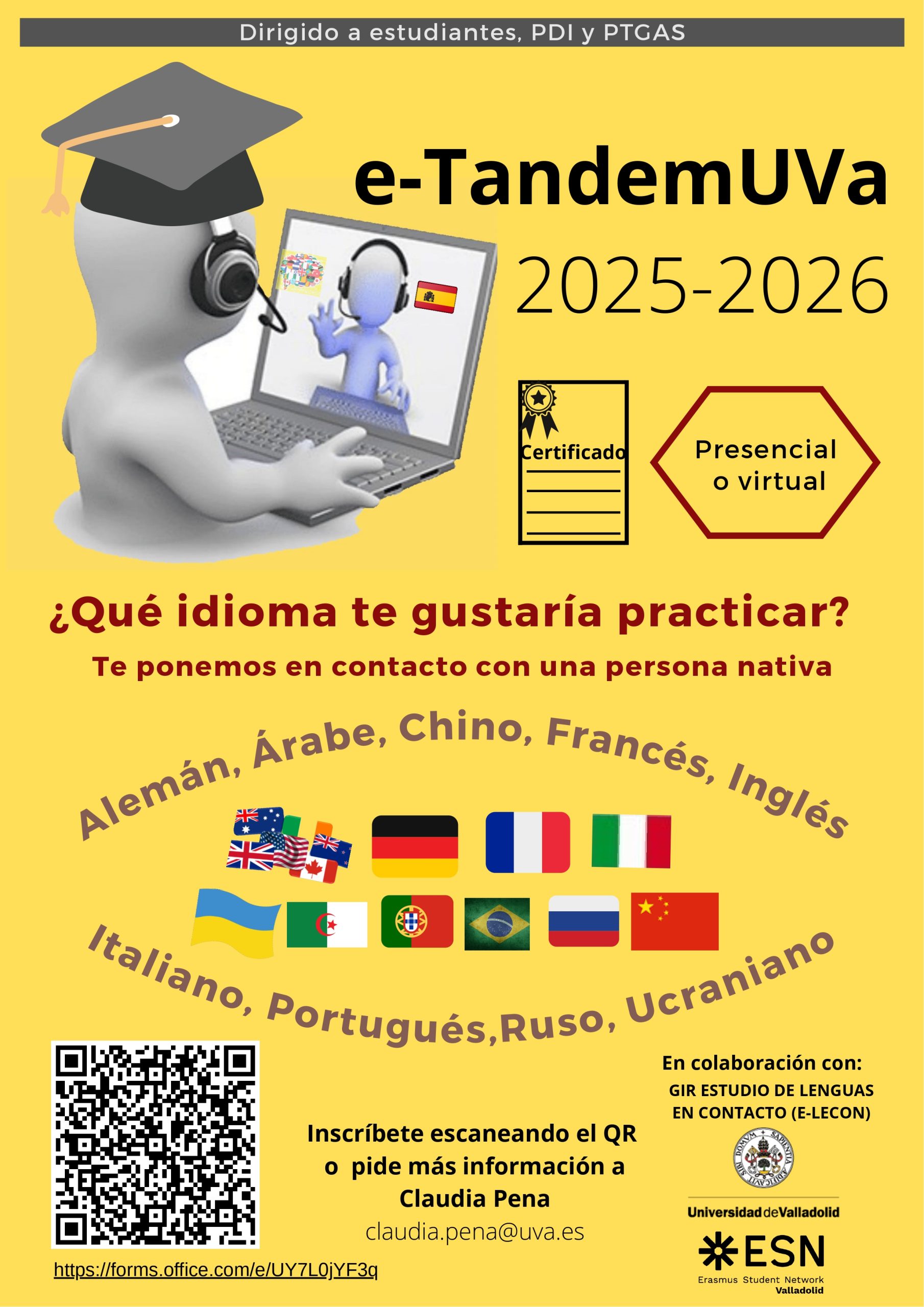 El PID e-TandemUVa es un Proyecto de Innovación Docente de la Universidad de Valladolid (UVa) que se inició en el curso 2019-2020 con el objetivo de fomentar y facilitar el aprendizaje de idiomas de los estudiantes de la UVa. El aprendizaje de idiomas en tándem es un método basado en el intercambio lingüístico mutuo por parejas, en el que cada participante es un hablante nativo de la lengua que el otro desea aprender.